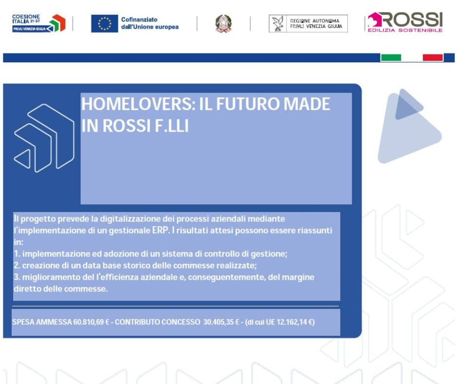 Il progetto “HOMELOVERS: Il futuro made in Rossi F.lli…”, realizzato presso la nostra sede di Basiliano (UD), ha l’obiettivo di modernizzare e digitalizzare i processi aziendali attraverso l’implementazione di un nuovo sistema gestionale ERP.